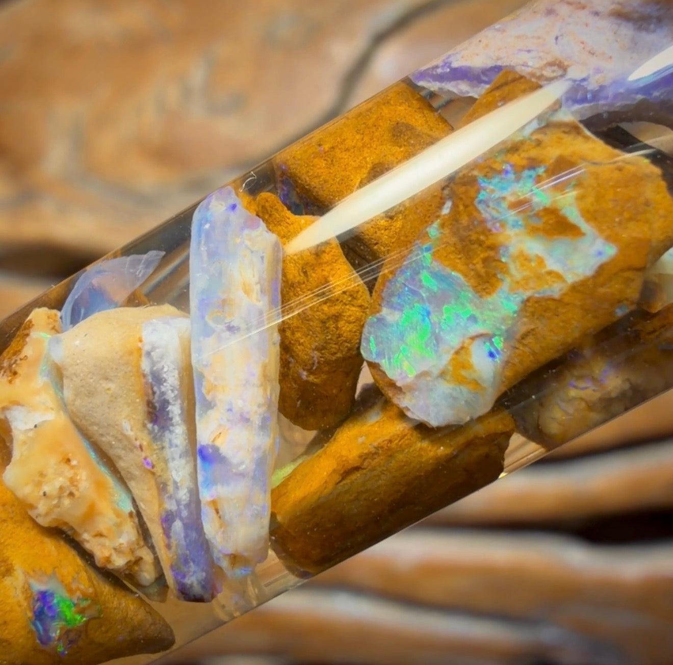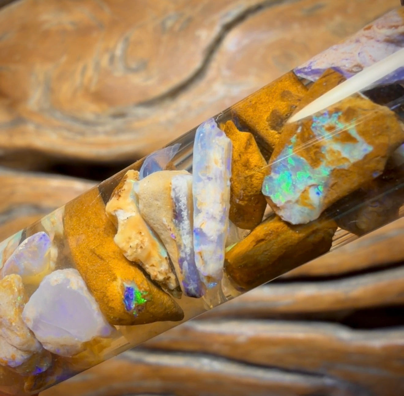 A beautiful vial of rough Opal chips and small pieces from Yowah including wood / vegetation fossil Opal!