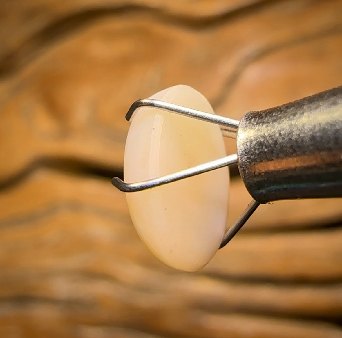Cut to a freeform oval cabochon with a high quality finishing polish.