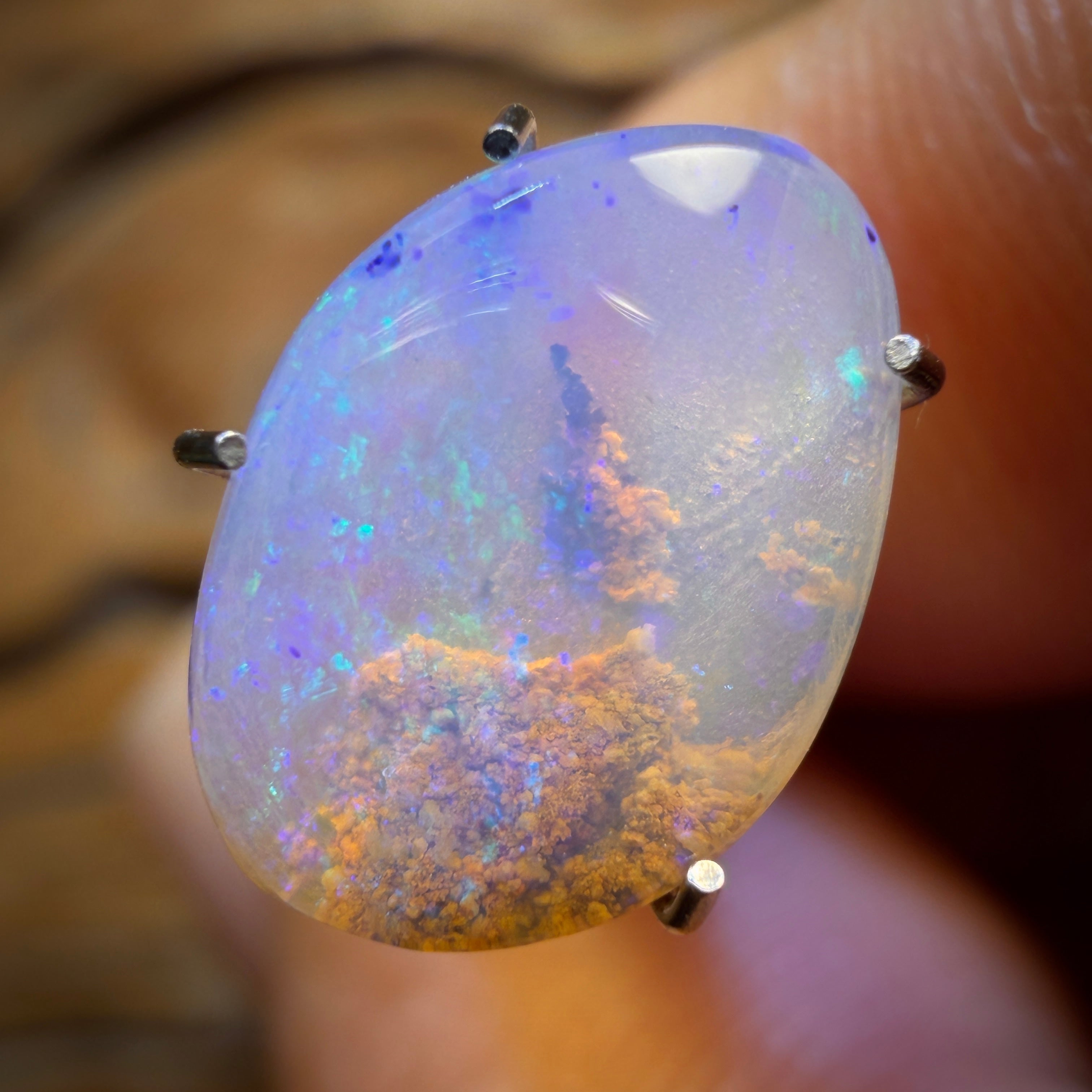 This stone displays suspended flashes of blue and green colouration in transparent crystal opal.