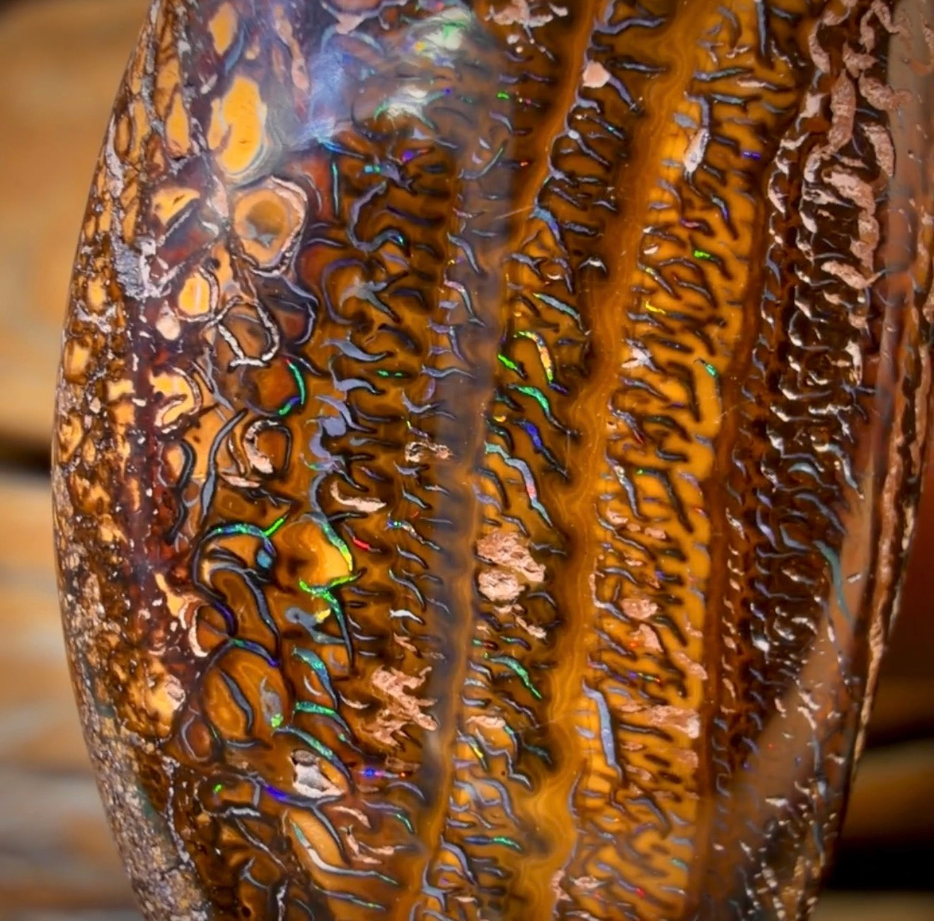 A beautiful Drilled Queensland Boulder Opal necklace displaying vibrant blue and green colouration in tight tribal patterns.