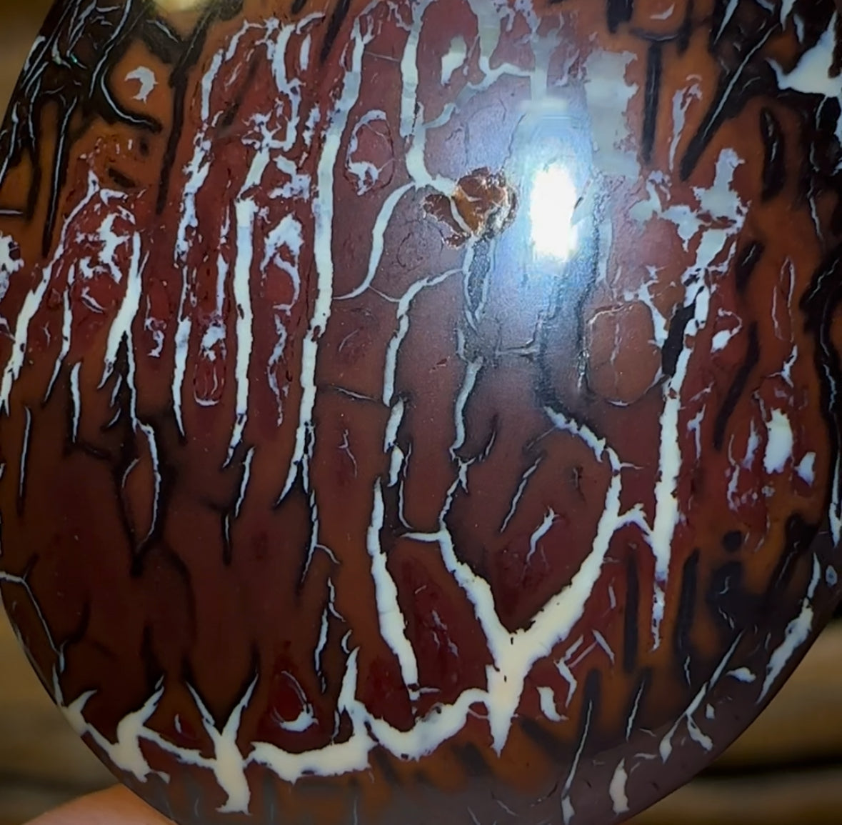 This stone displays white and grey potch Opal in artistic tribal patterns contrasting with dark ironstone.