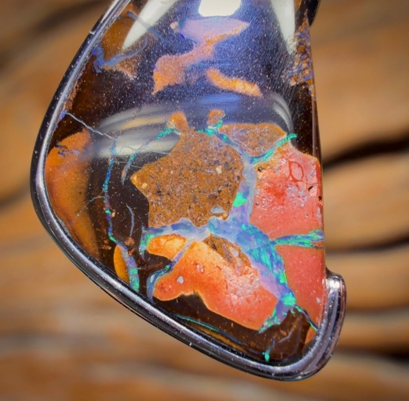 This pendant features a freeform shaped, solid Australian Boulder Opal displaying blue and green colouration in tribal patterns contrasting with tan earth tones.
