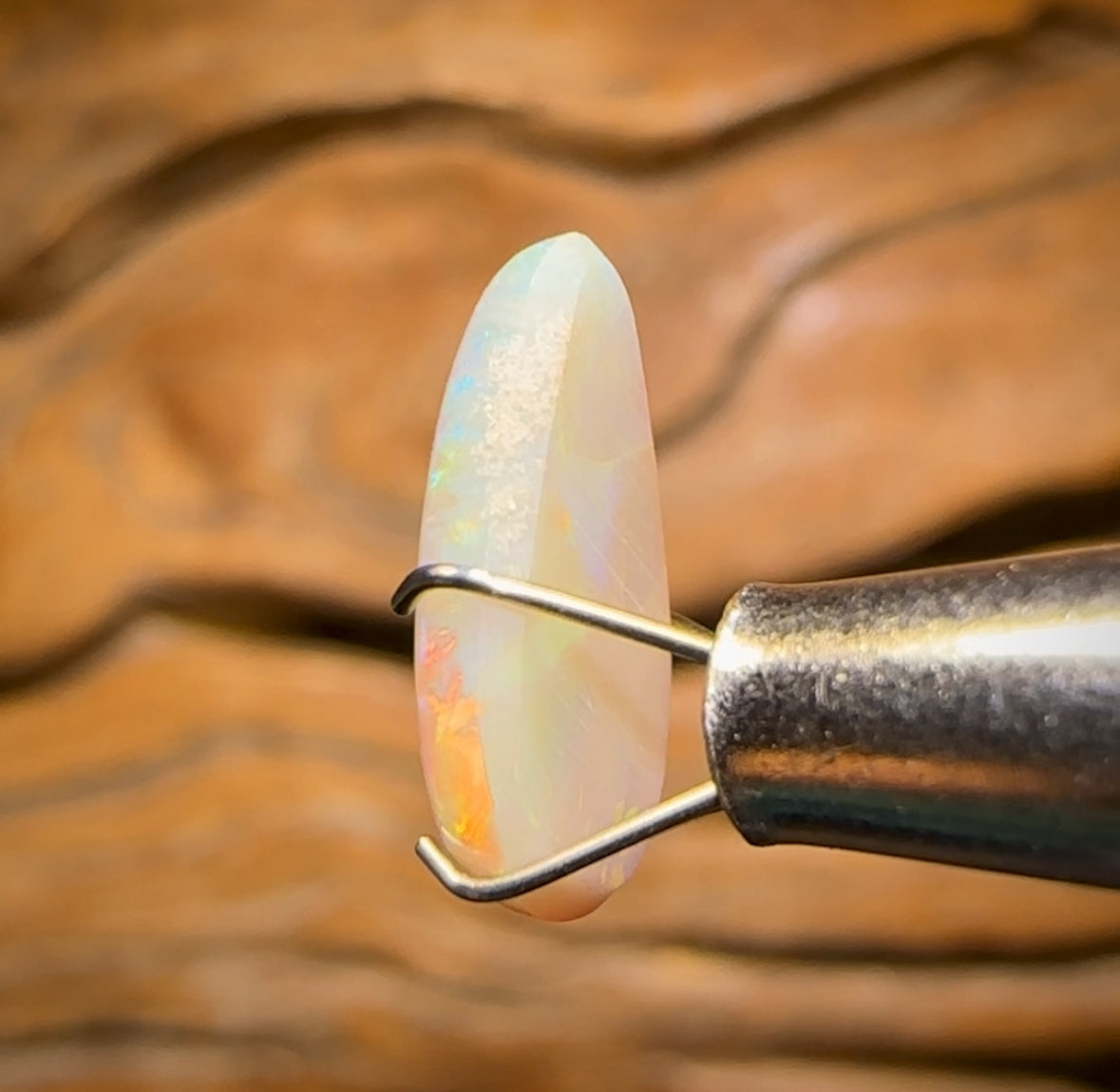 This stone displays vibrant red, orange, yellow, blue and green colouration in gorgeous flag and chaff patterns.