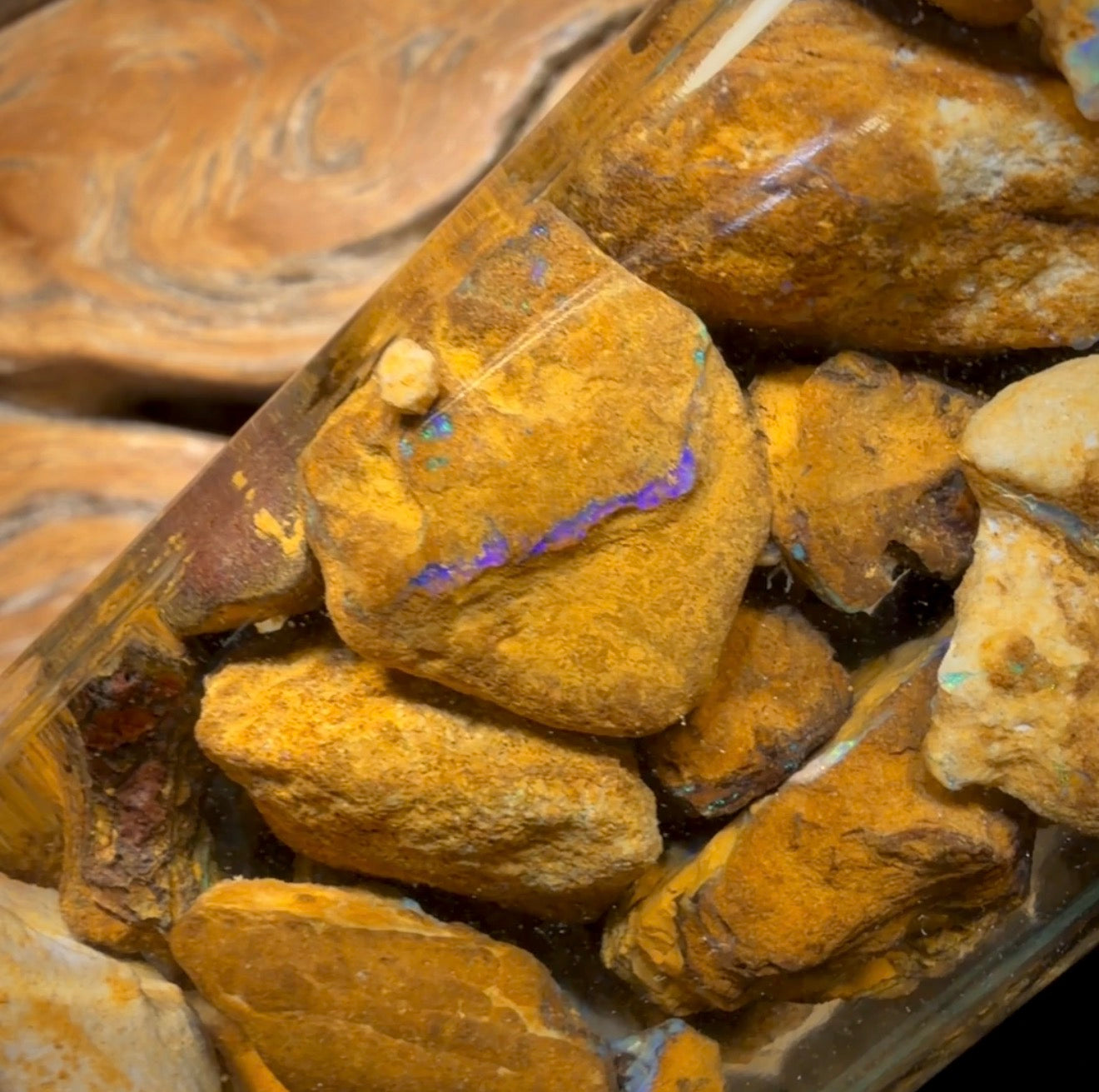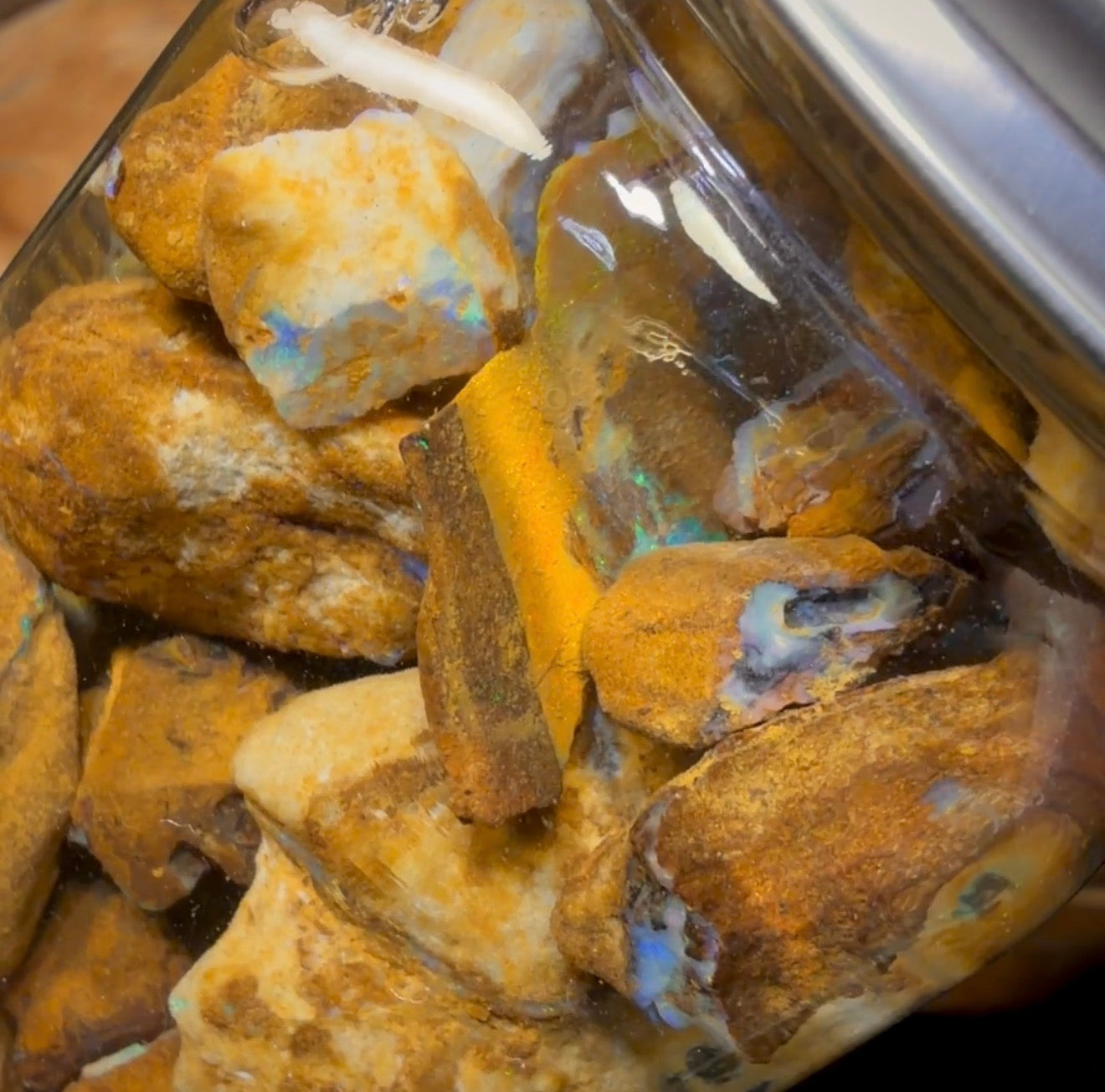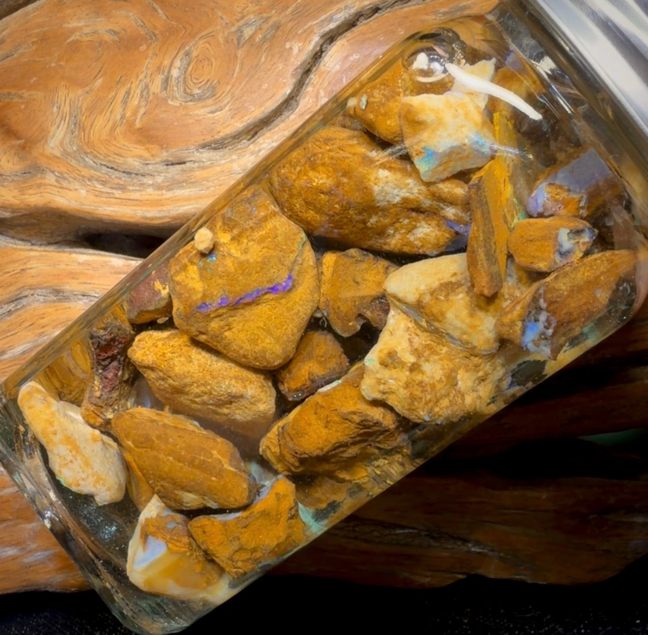 A beautiful Jar of rough Opal chips and small pieces from Yowah including wood / vegetation fossil Opal and partial Crystal Centres!