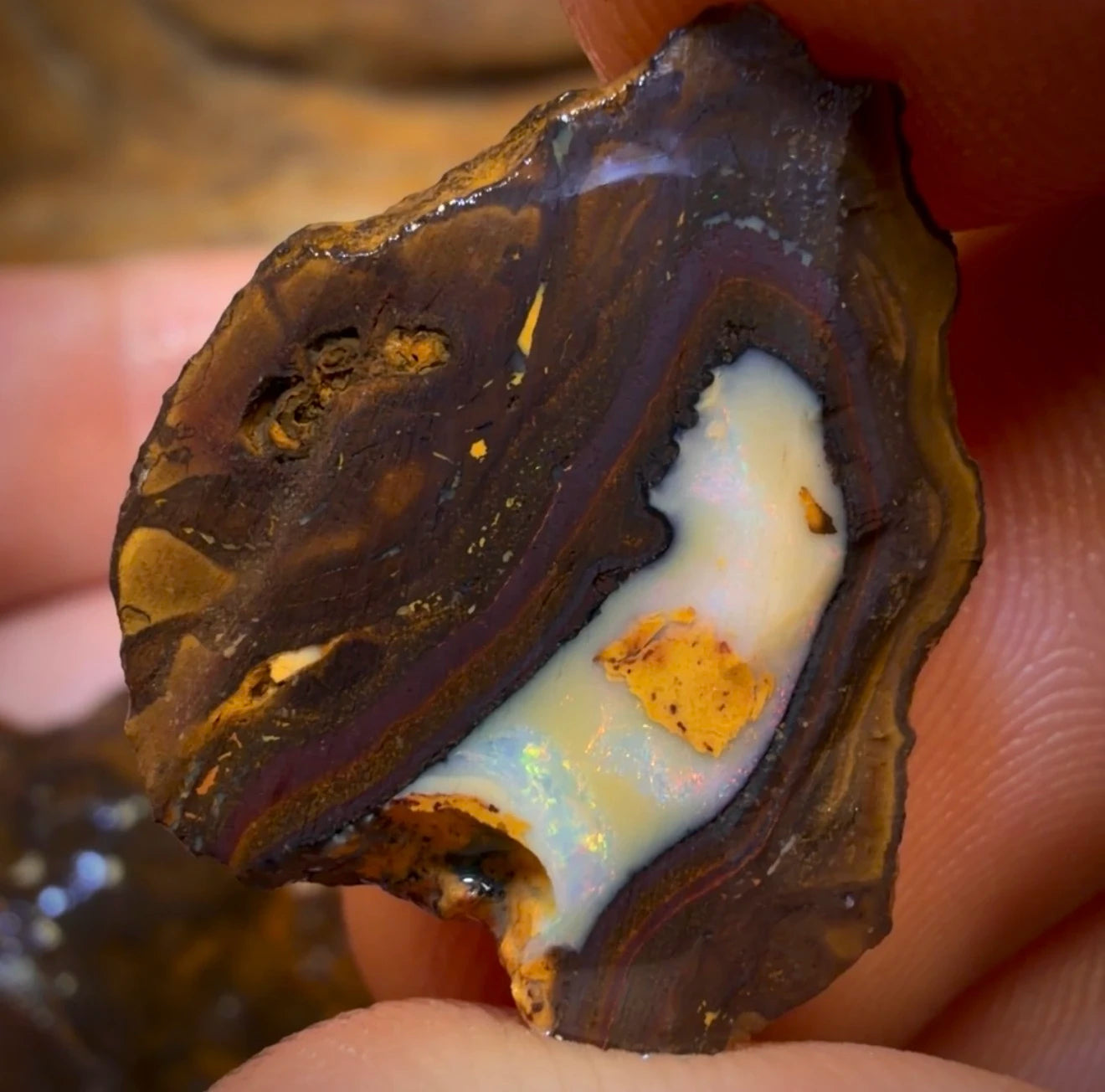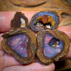 Ein wunderschönes Paket roher Yowah-Nussopale mit teilweise kristallisierten Zentren, die blaue und grüne Farbschimmer aufweisen.