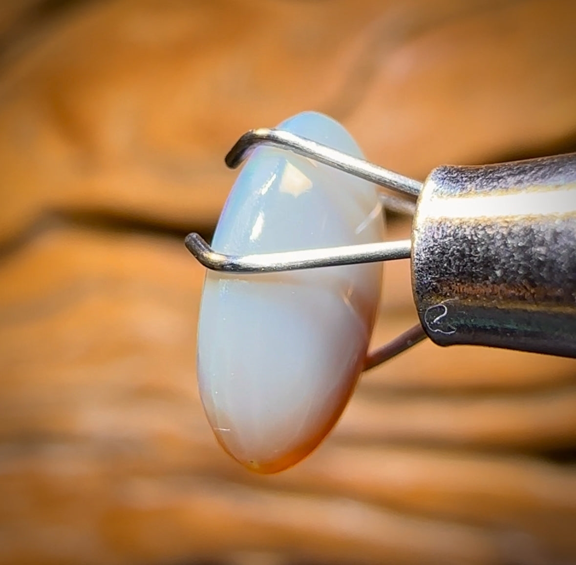 Cut to a freeform oval cabochon with a high quality finishing polish.