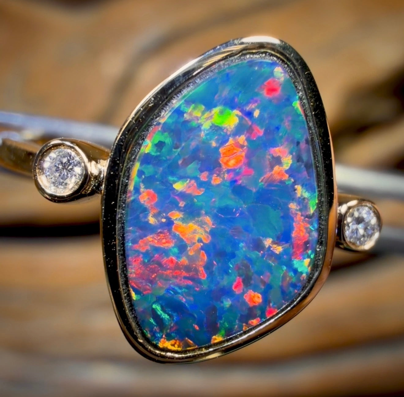 Ein wunderschöner Queensland Boulder Opal Doublet Ring, gefertigt aus echtem 14-karätigem Gelbgold.