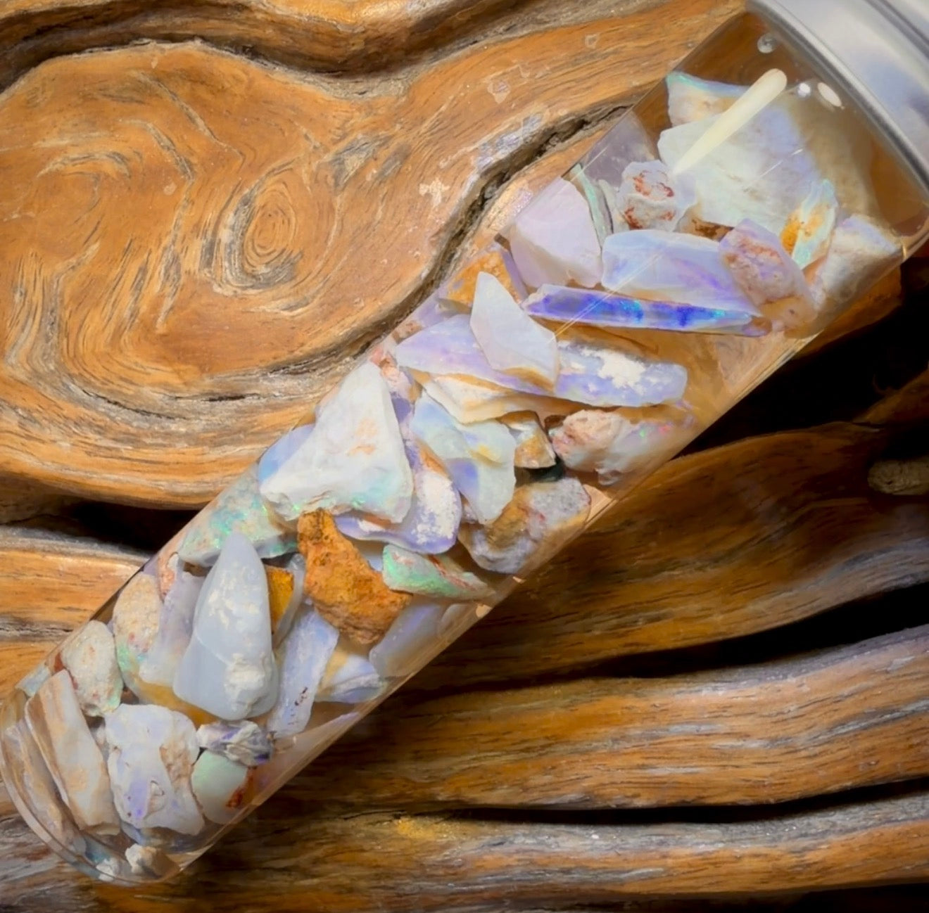 Ein großes Fläschchen mit hochwertigen Lightning Ridge Dark-, Light- und Kristallopal-Splittern, die überwiegend blaue, grüne und violette Farbtöne aufweisen.