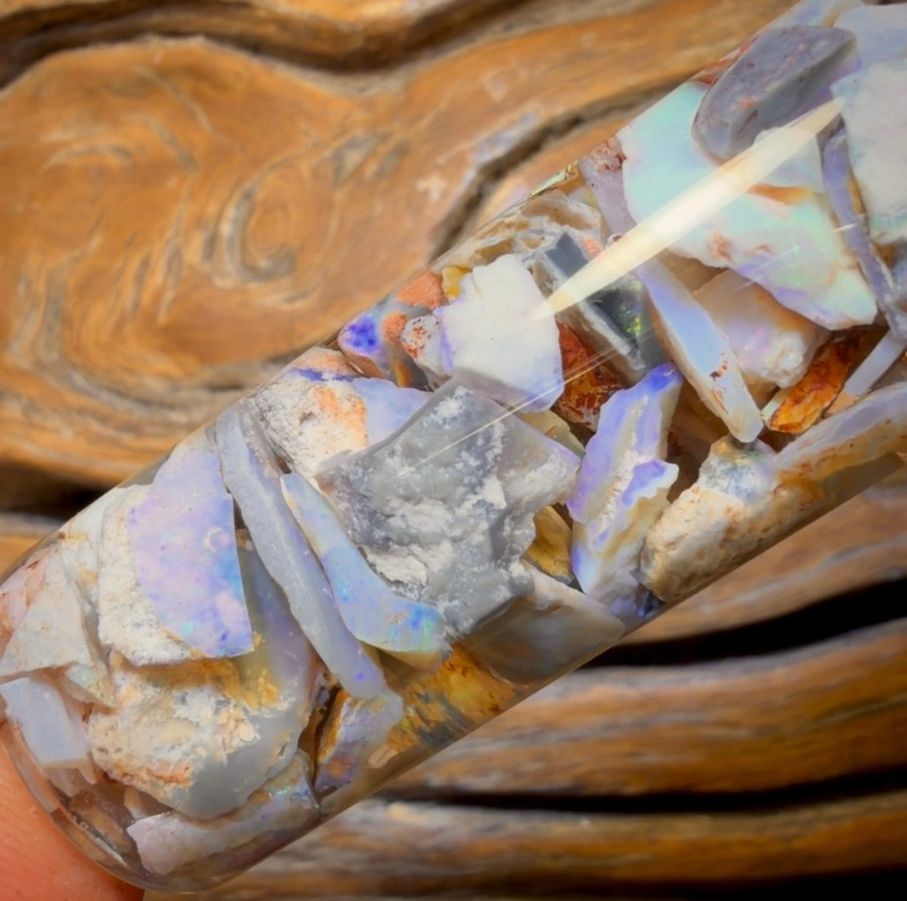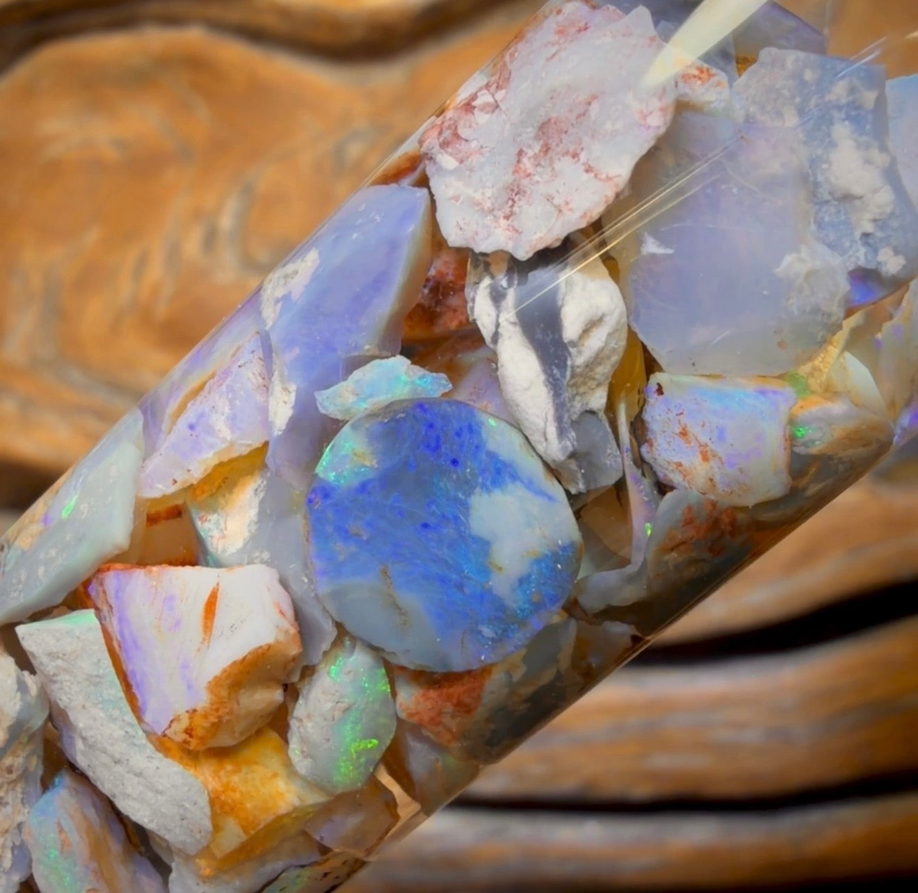 Ein großes Fläschchen mit hochwertigen Lightning Ridge Dark-, Light- und Kristallopal-Splittern, die überwiegend blaue, grüne und violette Farbtöne aufweisen.