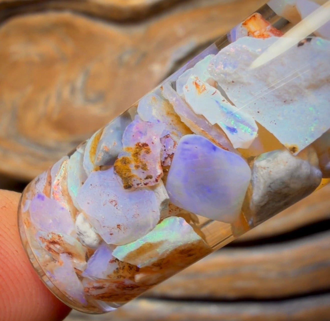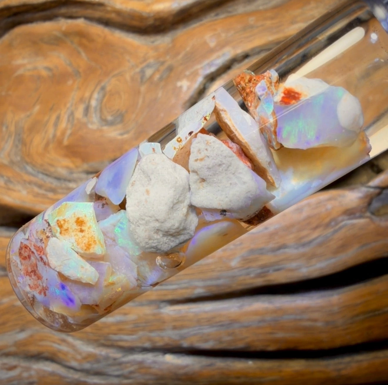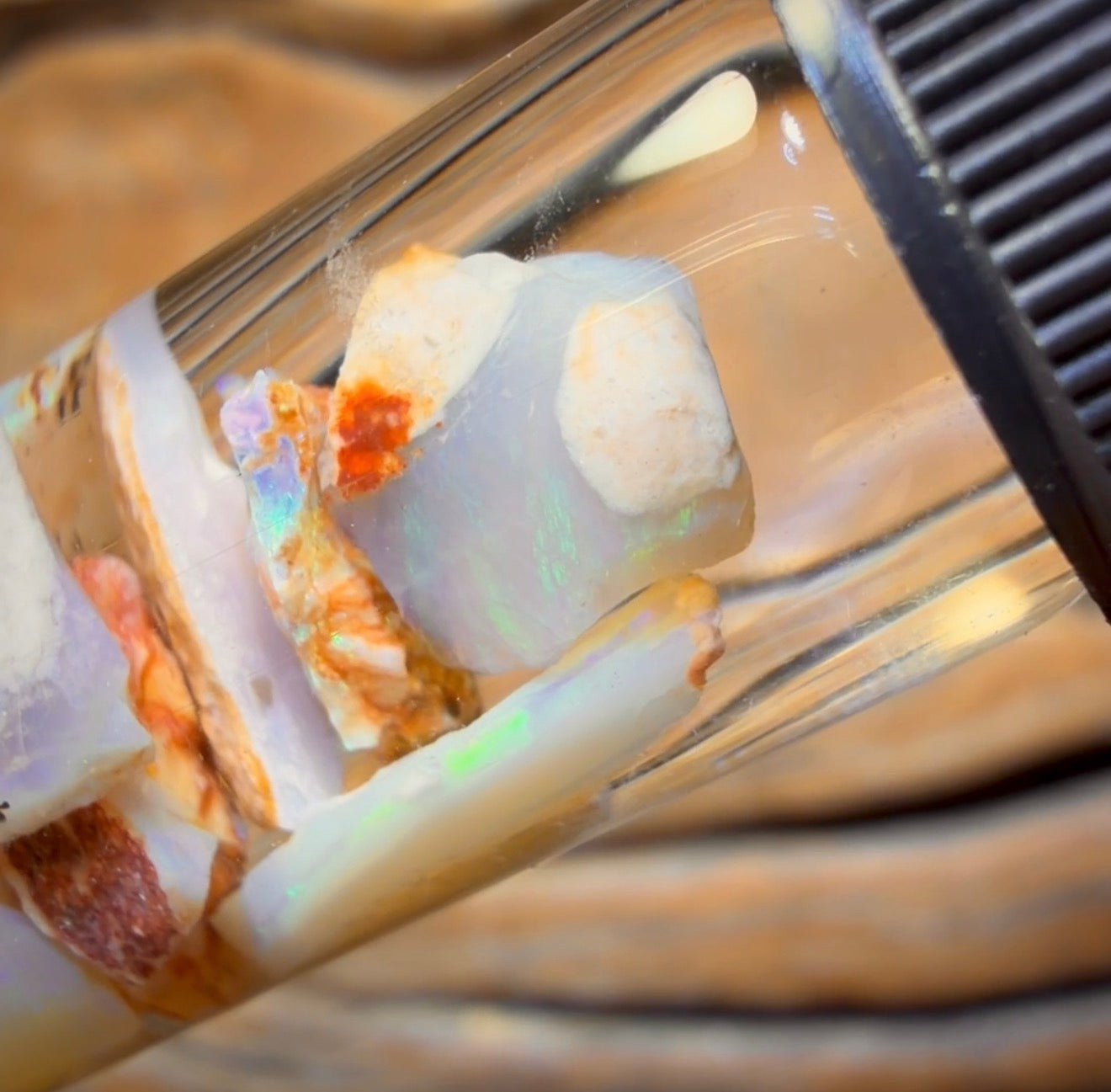 Ein kleines Fläschchen mit hochwertigen Lightning Ridge Dark-, Light- und Kristallopal-Splittern, die überwiegend blaue, grüne und violette Farbtöne aufweisen.