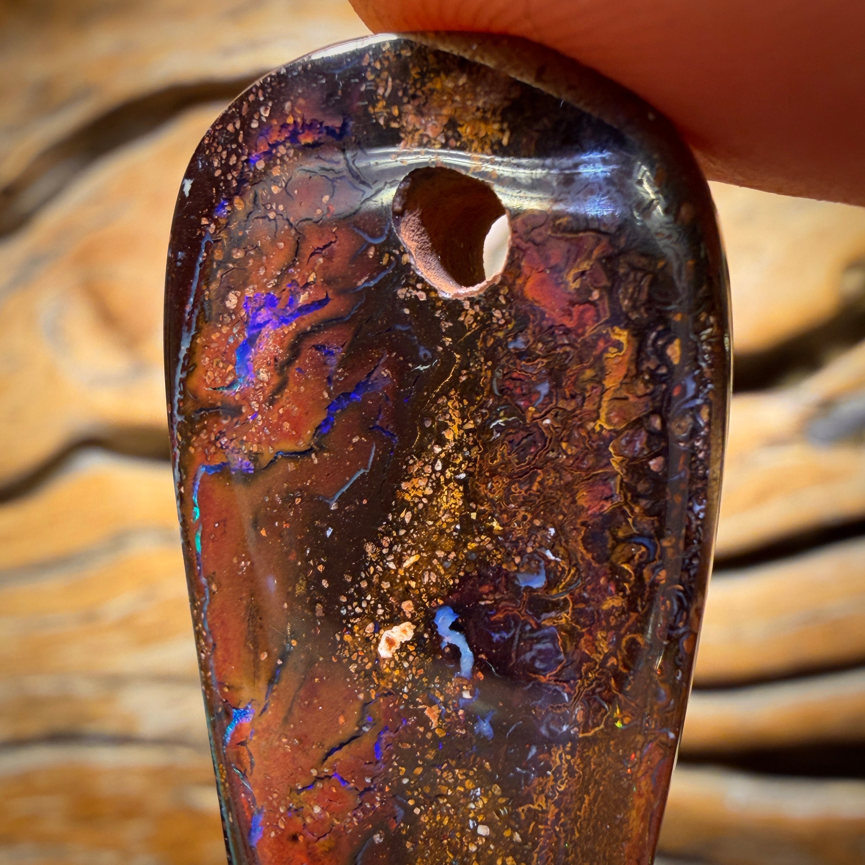 ADD AN OW SILVER CLASP ! A beautiful Drilled Queensland Boulder Opal displaying blue and green colouration in tribal patterns.