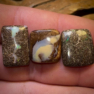A parcel of 3x solid Queensland Boulder Opals displaying green and blue colouration.