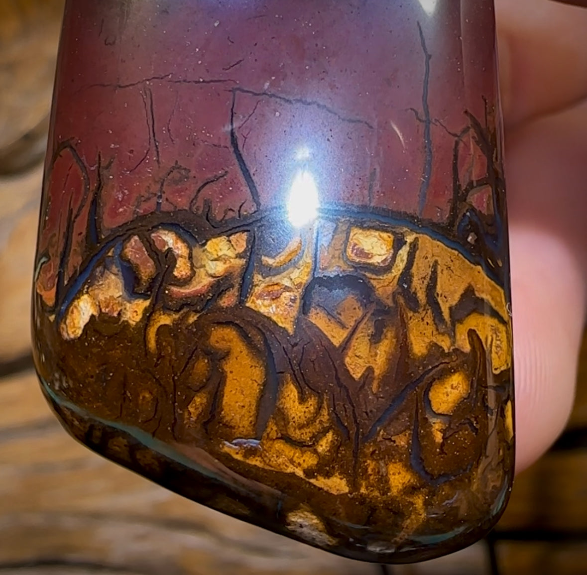 This stone displays potch opal in tribal patterns contrasting with dark earth tones.