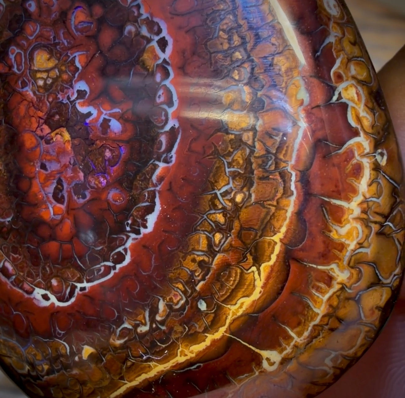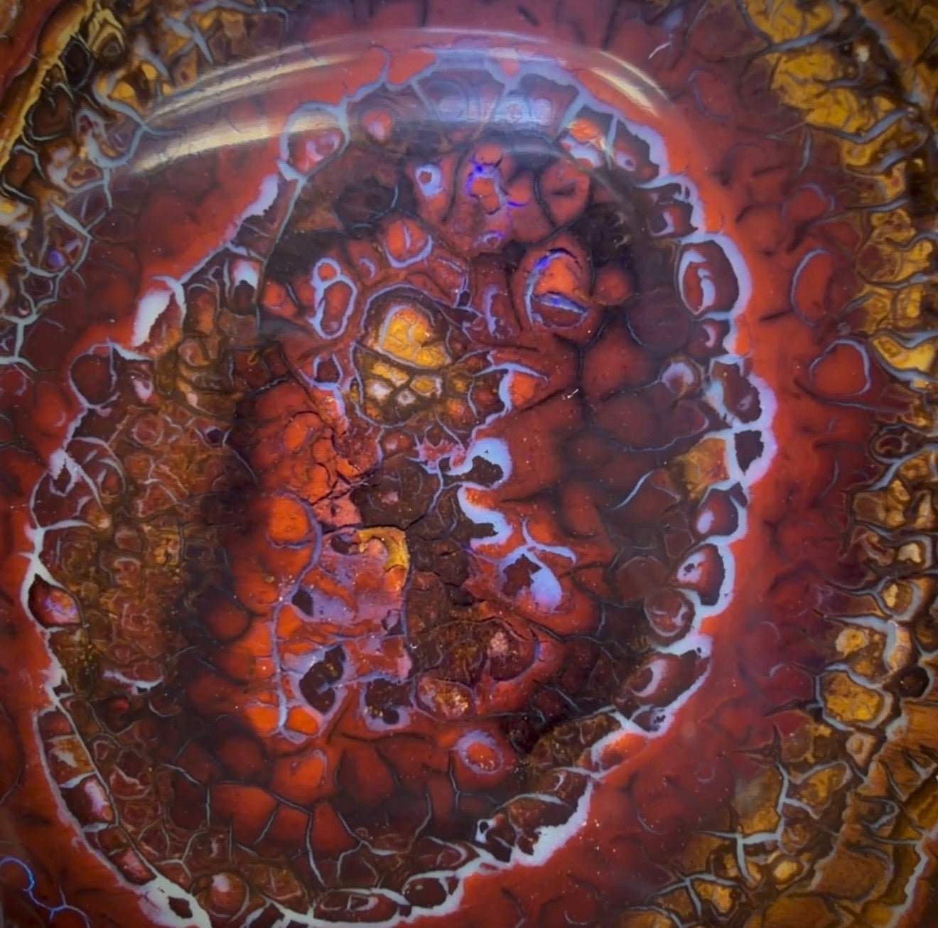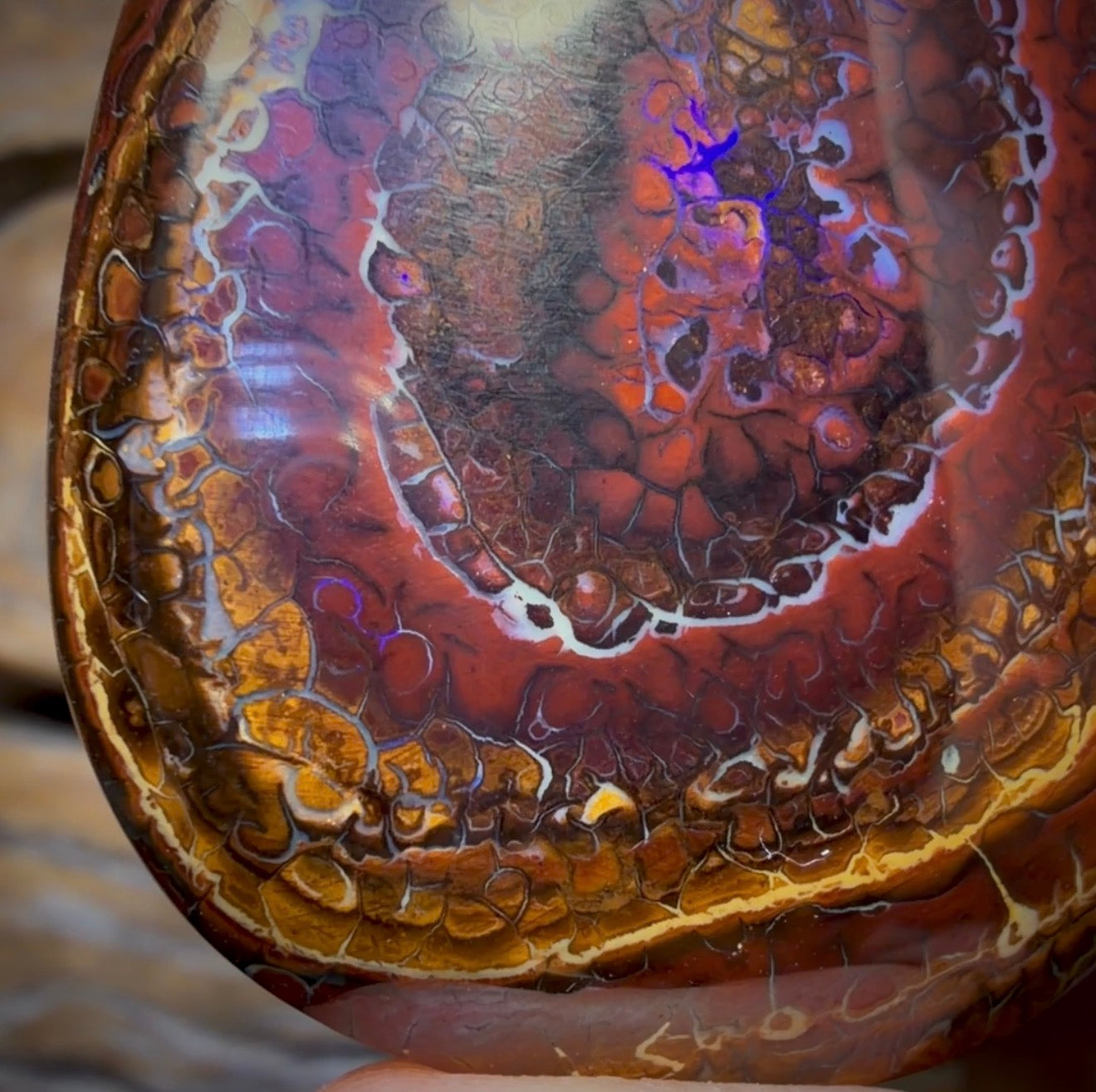 This stone displays predominantly blue colouration contrasting with a range of gorgeous earth tones in rings of intricate tribal patterns.