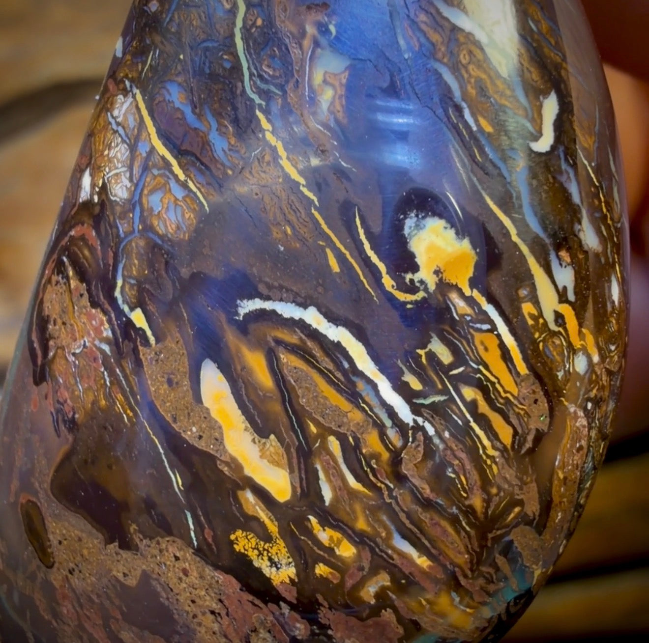 This stone displays orange and white potch opal in gorgeous tribal patterns contrasting with dark earth tones.