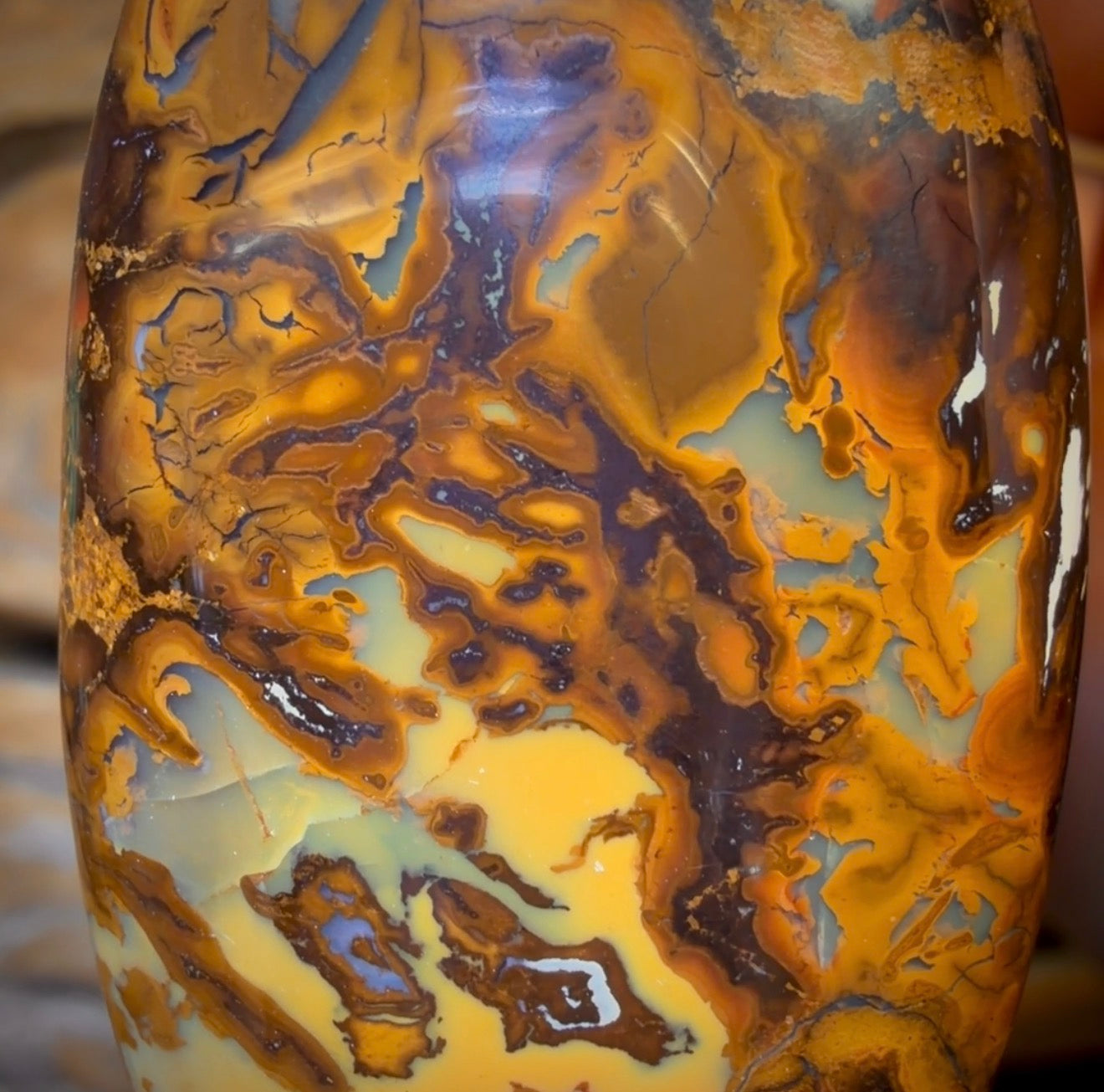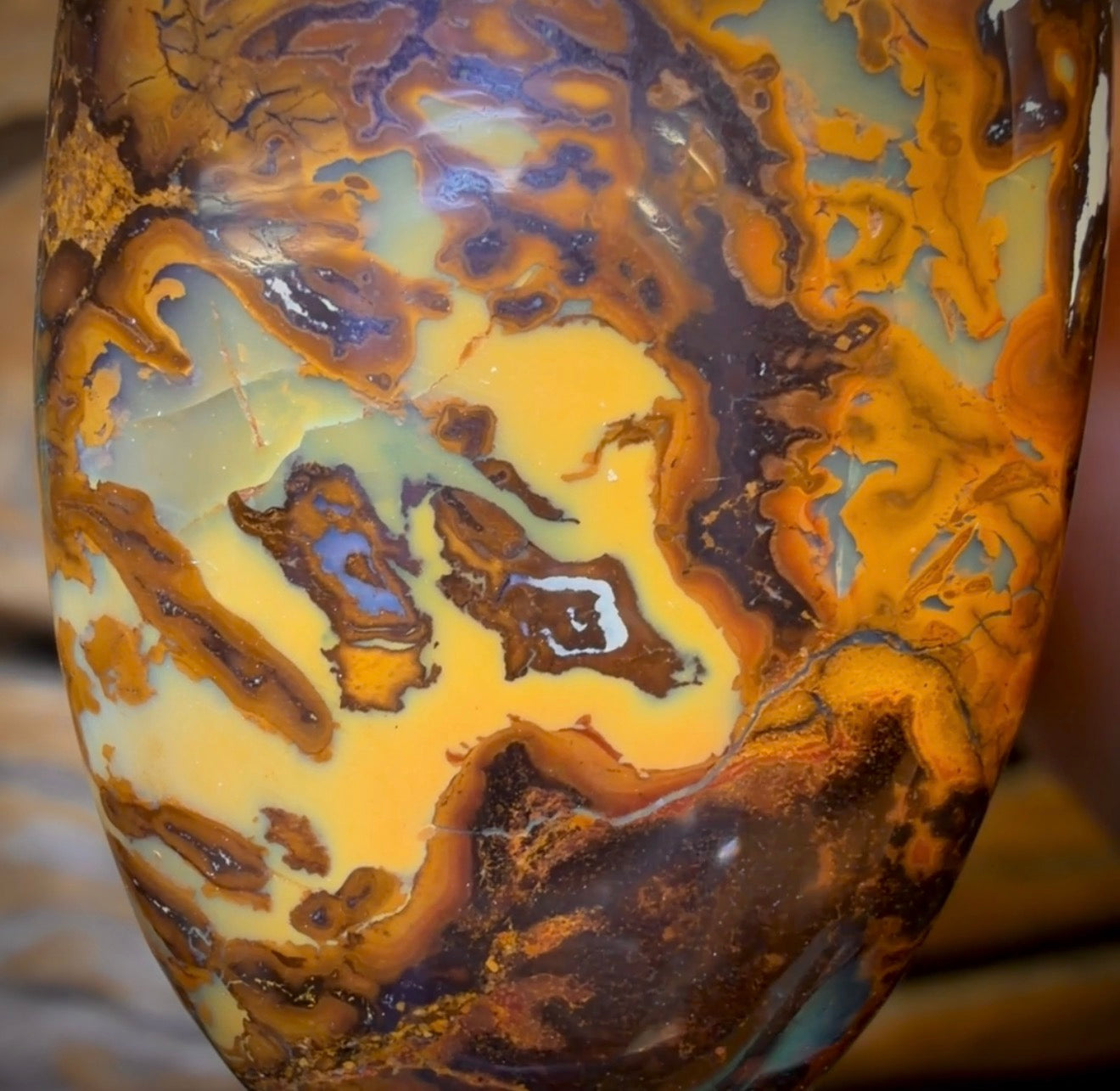This stone displays potch opal contrasting with tan earth tones in tribal patterns and pools of opal.