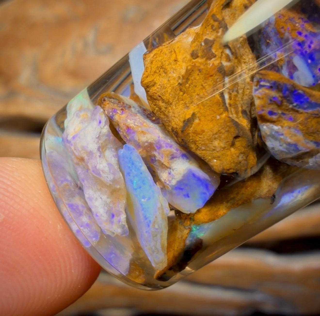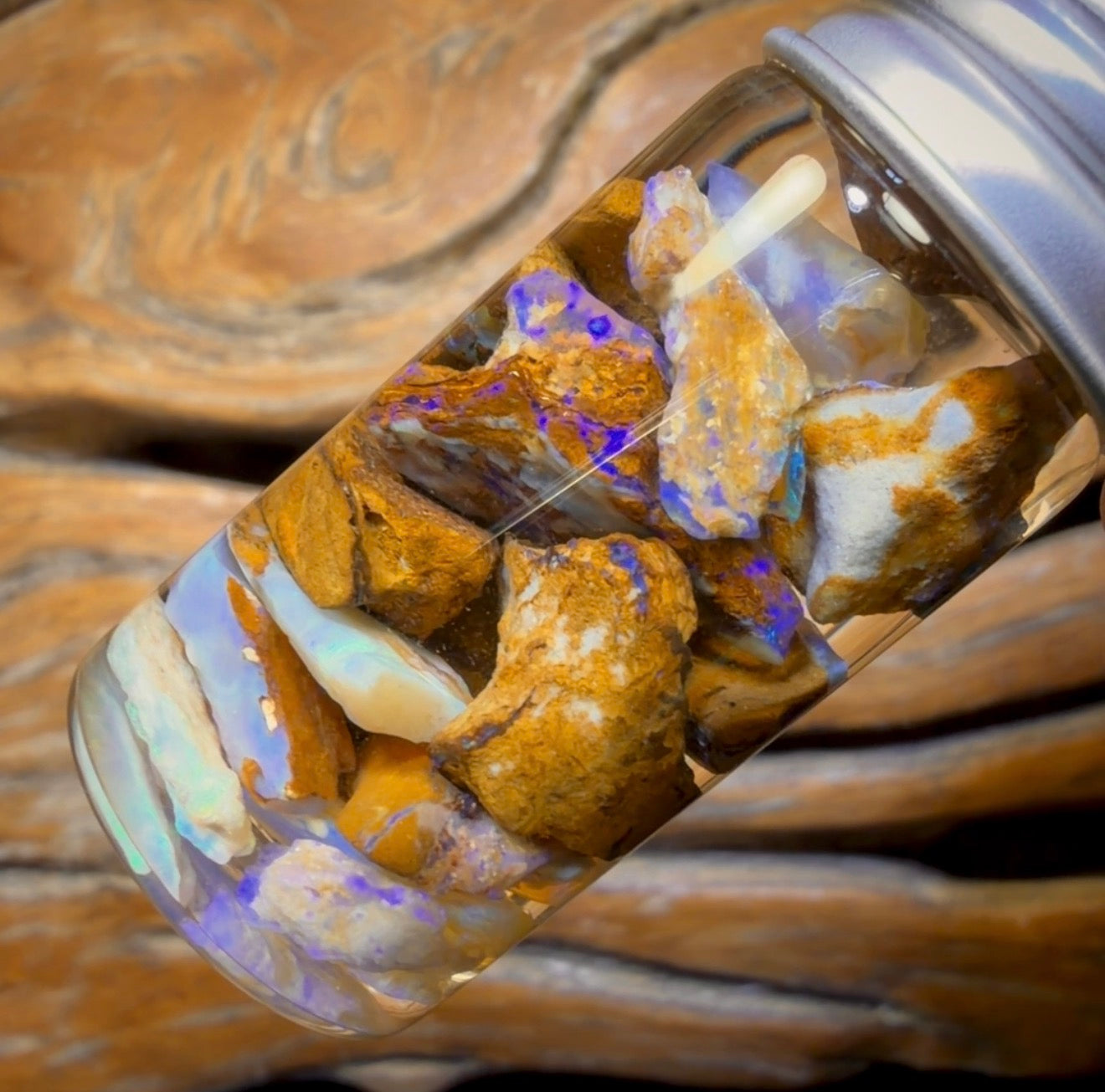 A beautiful vial of rough Opal chips and small pieces from Yowah including wood / vegetation fossil Opal!