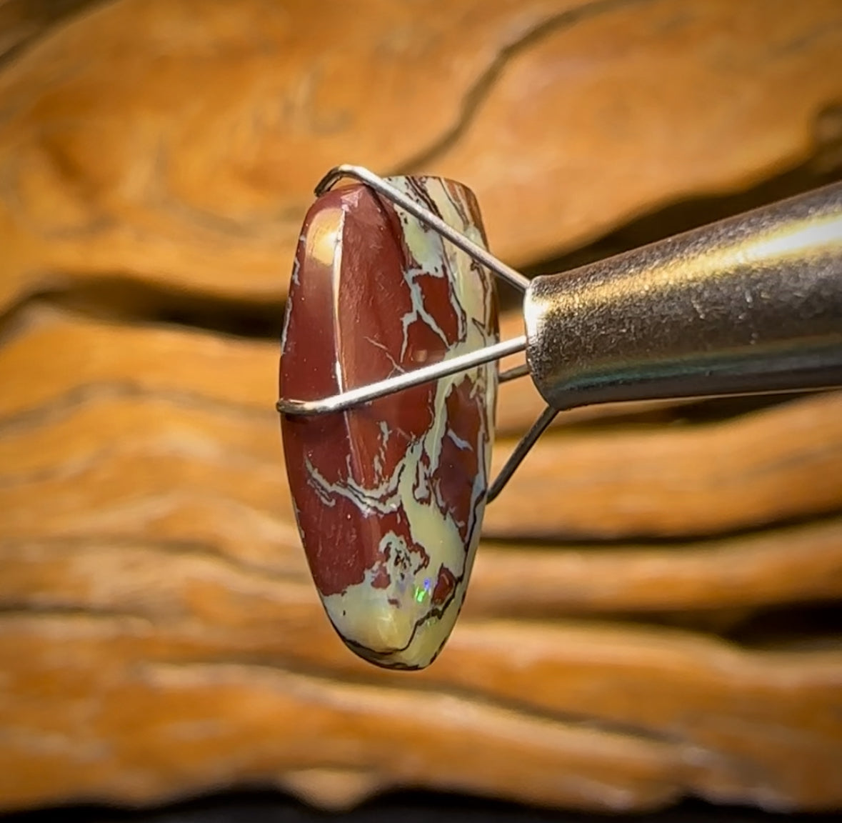 This stone displays orange, green and blue colouration in pools of opal contrasting with earth tones.