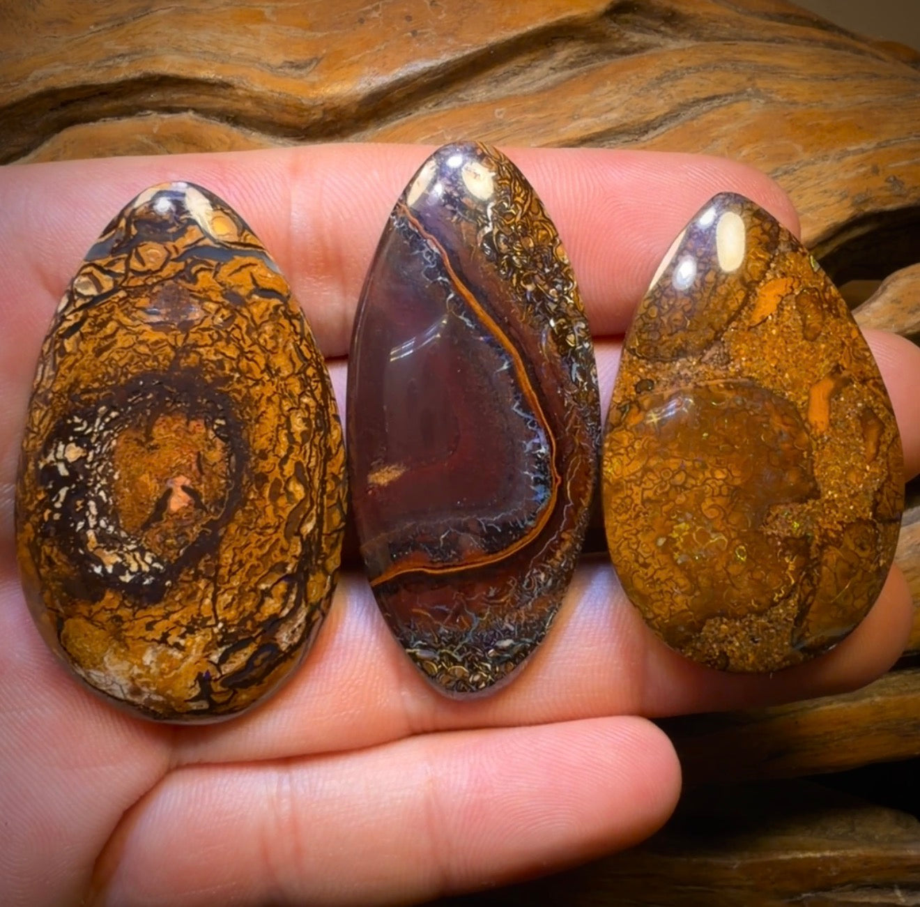 A beautiful parcel of Queensland Boulder Opals from Yowah and Koroit displaying predominantly blue and green colouration in tribal patterns.