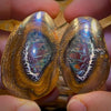 This pair displays red, orange, blue and green colouration alongside potch opal in kernels with tribal patterns contrasting gorgeously with dark earth tones.