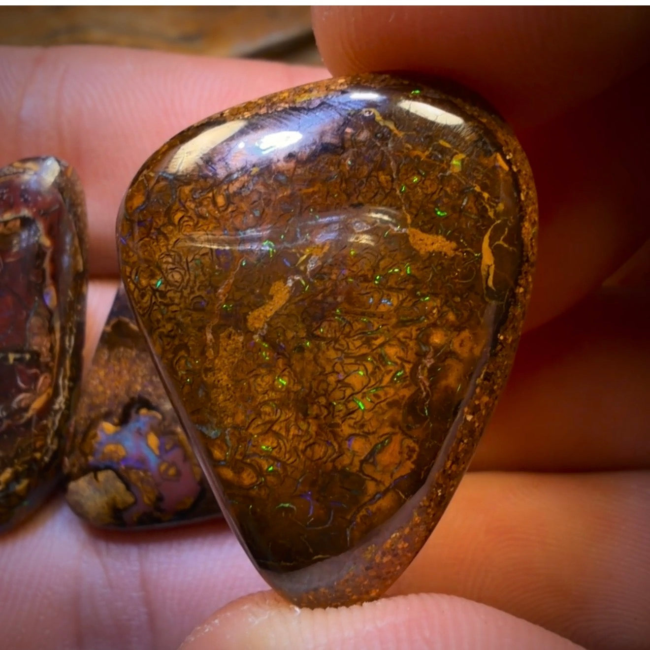 A beautiful parcel of Queensland Boulder Opals from Yowah and Koroit displaying predominantly blue and green colouration in tribal patterns.