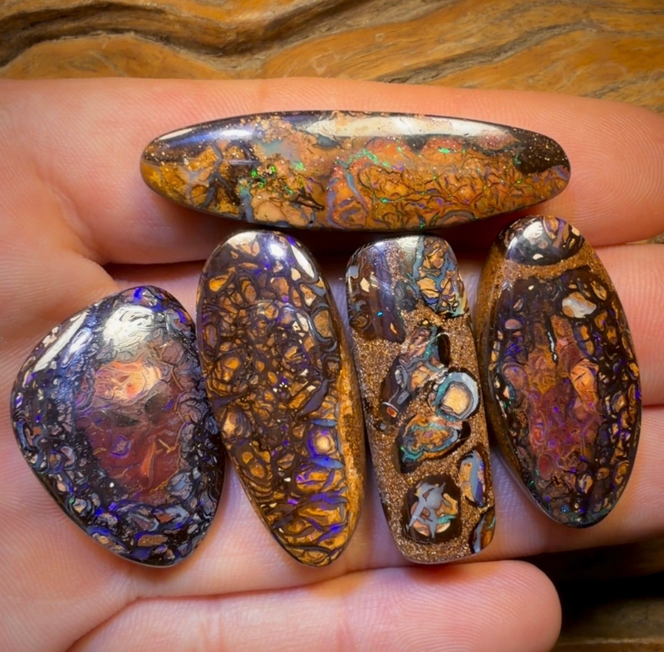 A beautiful parcel of Queensland Boulder Opals from Yowah and Koroit displaying predominantly blue and green colouration in tribal patterns.