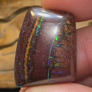 Displaying tribal patterns with predominantly blue, green and purple colouration contrasting with dark burgundy coloured ironstone.