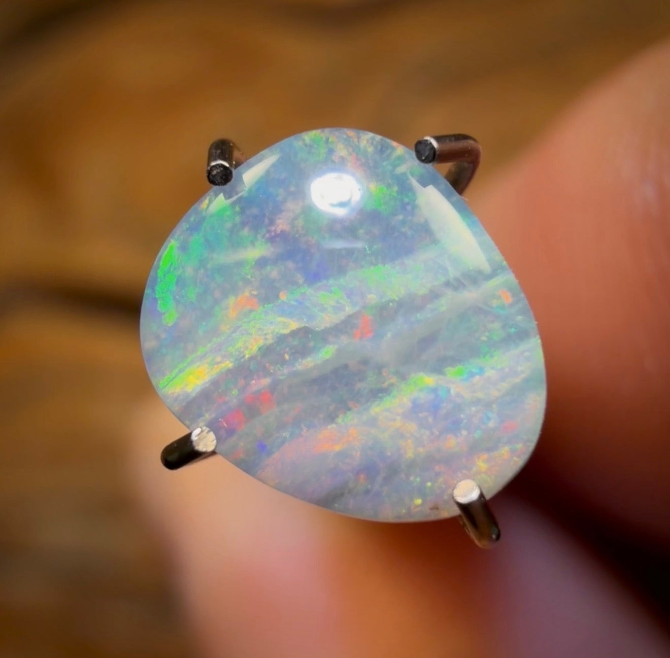 This stone displays vibrant blue, green, yellow and orange colouration in flag patterns.