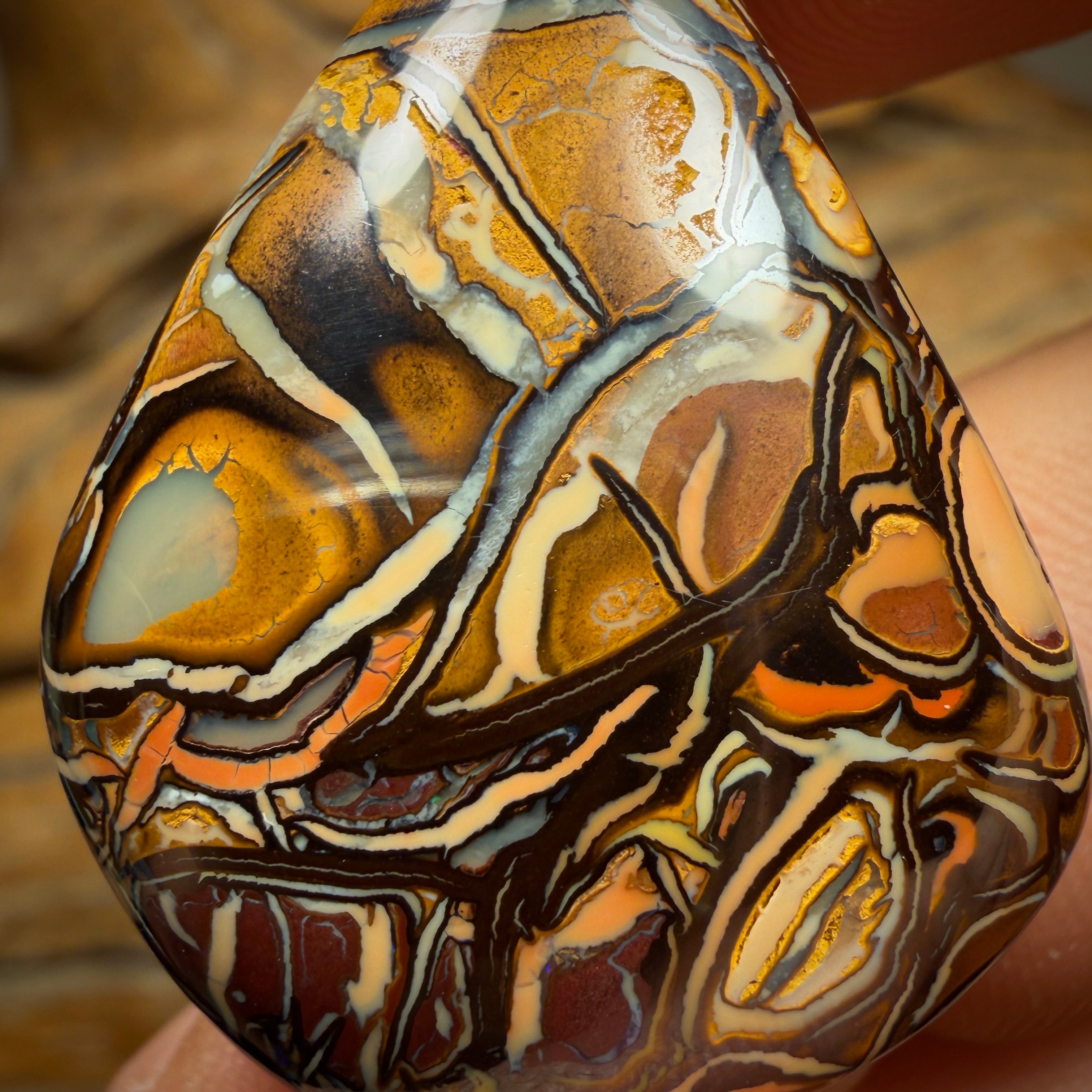 This stone displays white and orange potch opal contrasting with dark and light ironstone in stunning tribal patterns unique to the area.