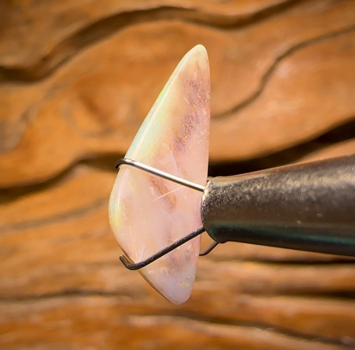 This stone displays orange, yellow, green and blue colouration in beautiful galaxy and pinfire patterns.