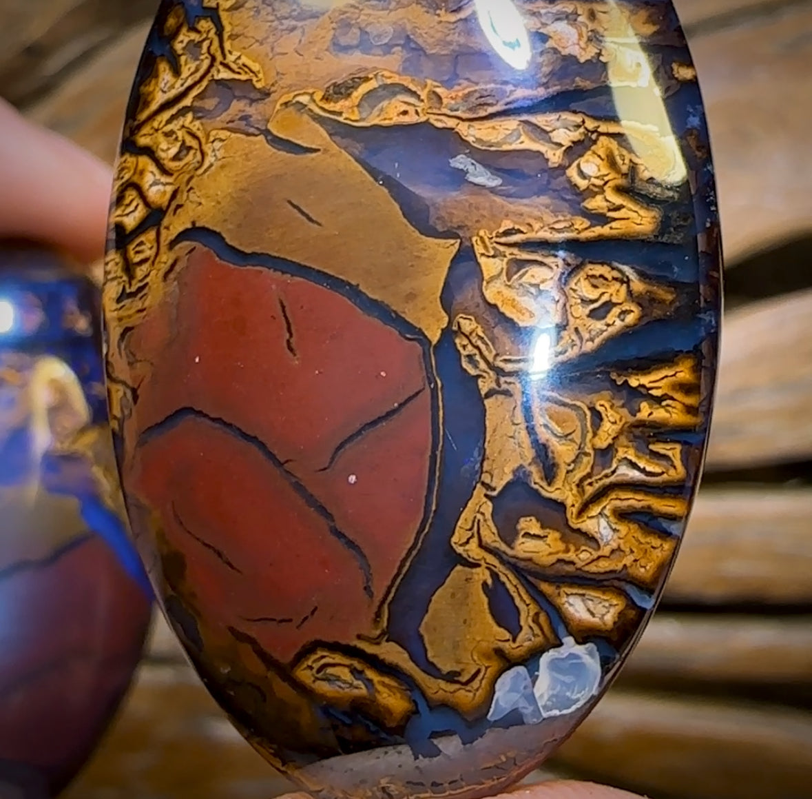 A beautiful Australian Boulder Opal pair cut from a Yowah Nut with rare broad tribal patterns!