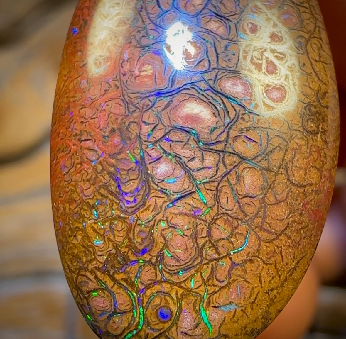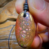 A gorgeous Drilled Queensland Boulder Opal necklace displaying electric green and blue colouration in tight and intricate tribal patterns.