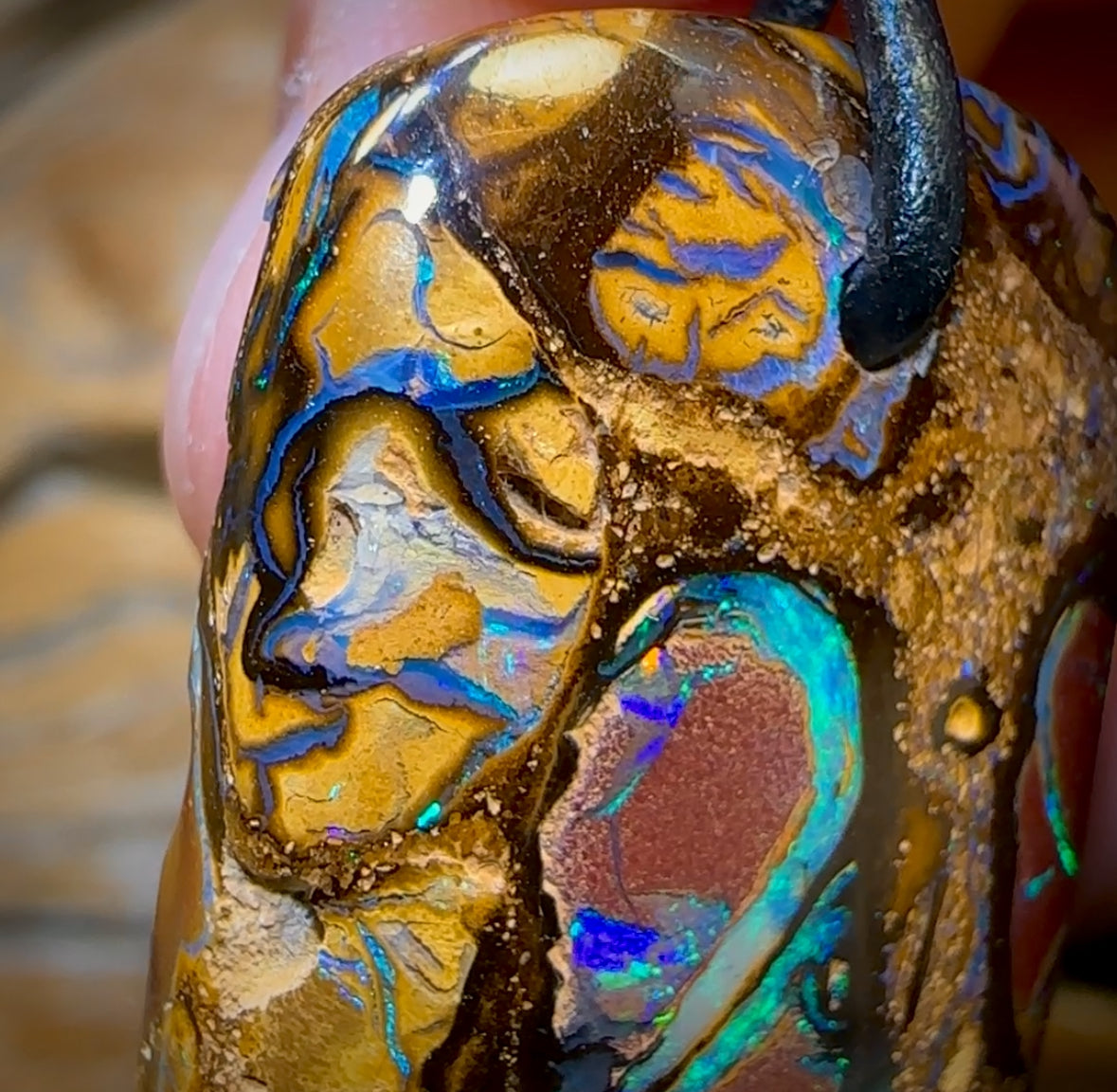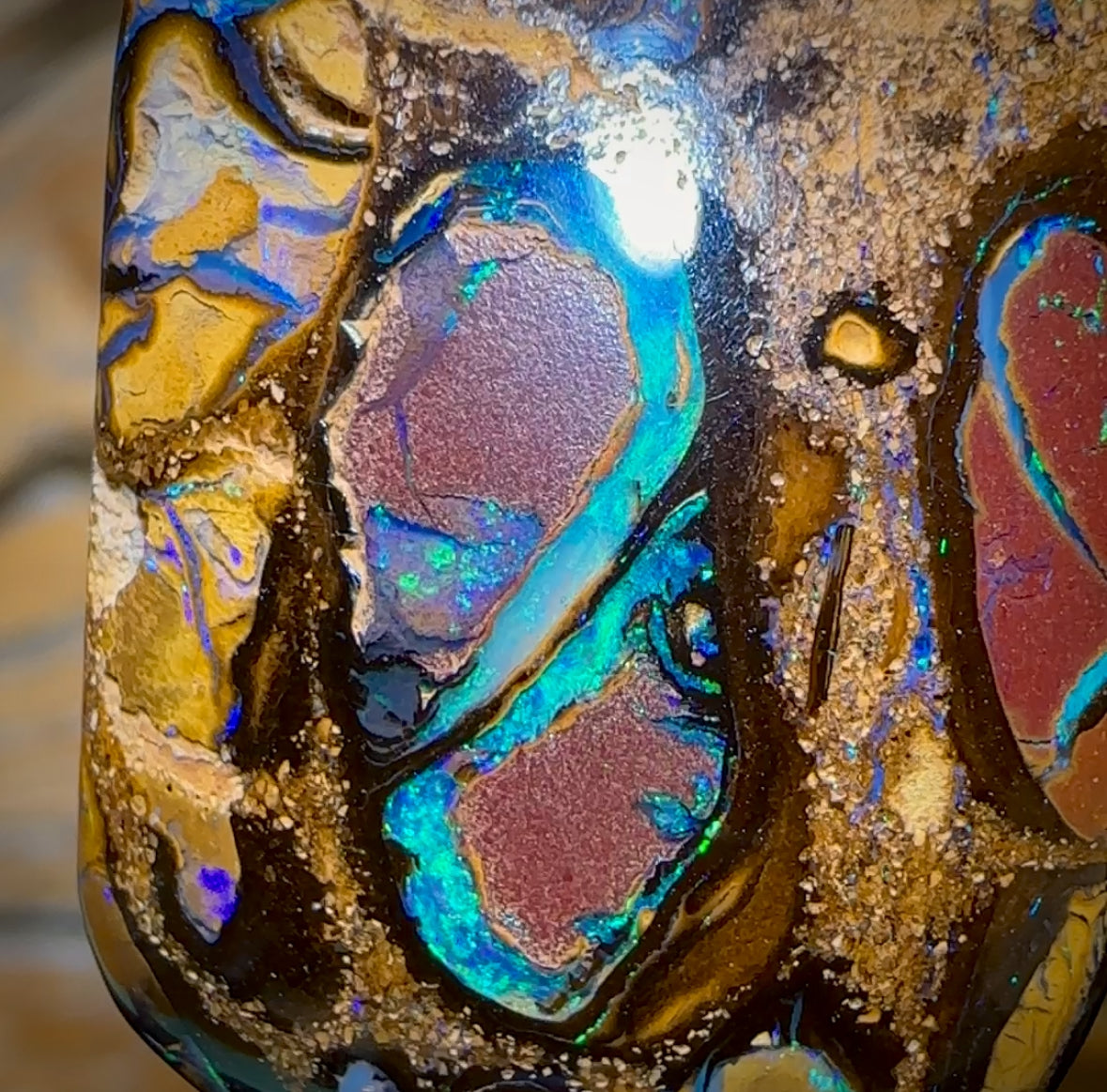 A beautiful Drilled Queensland Boulder Opal necklace from the Yowah Nut Conglomerate formation, displaying vibrant blue and green colouration in tribal patterns and pools of opal.