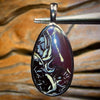 This pendant features a teardrop shaped, solid Australian Boulder Opal displaying beautiful white potch opal in beautiful tribal patterns contrasting with dark earth tones.