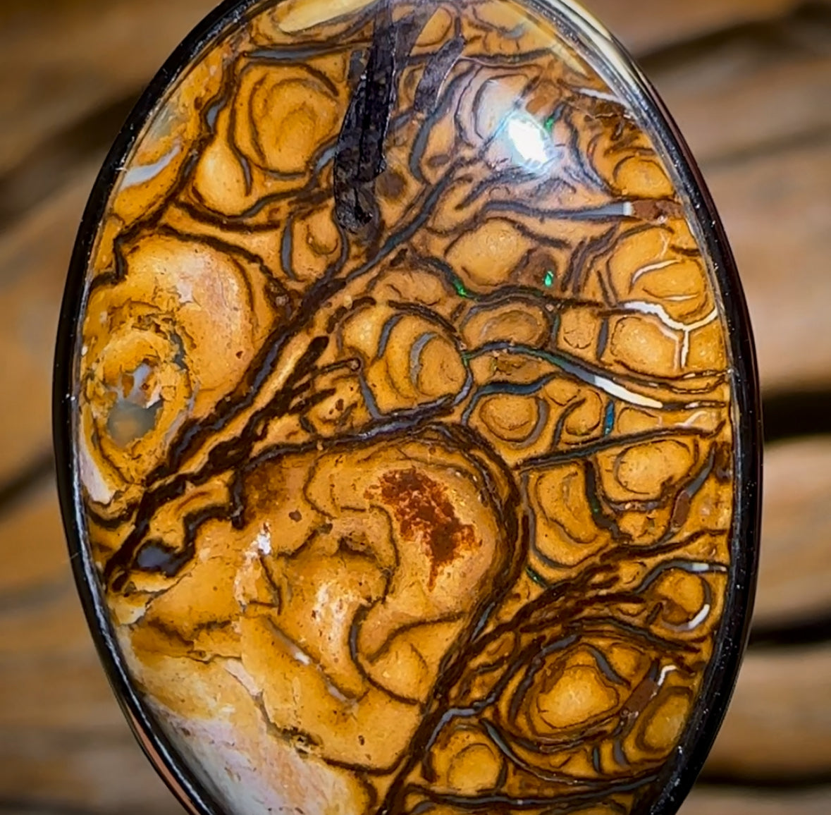 This pendant features an oval shaped, solid Australian Boulder Opal displaying hints of blue and green colouration in beautiful tribal patterns contrasting with tan ironstone.