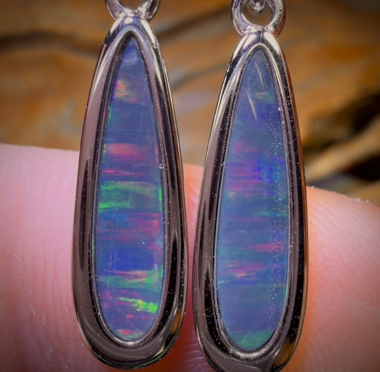 These earrings feature teardrop shaped, high-quality, Australian Boulder Opal Doublets made using all natural materials.