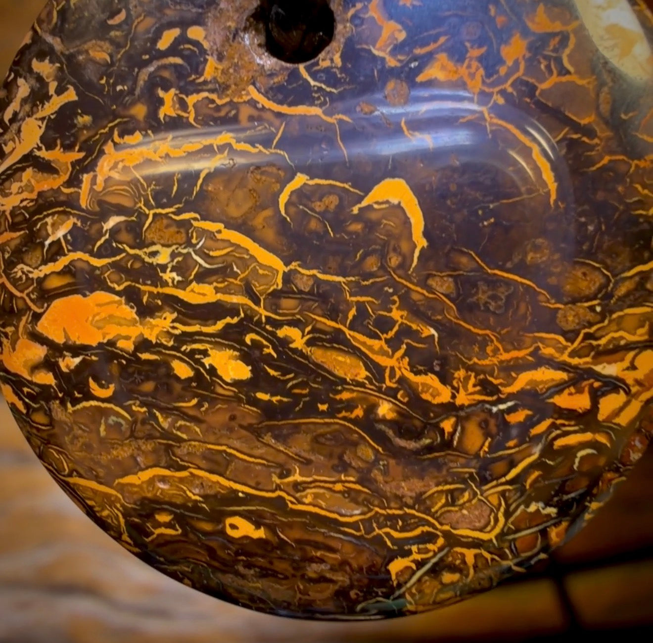 This stone displays orange potch opal in intricate tribal patterns contrasting with dark earth tones.