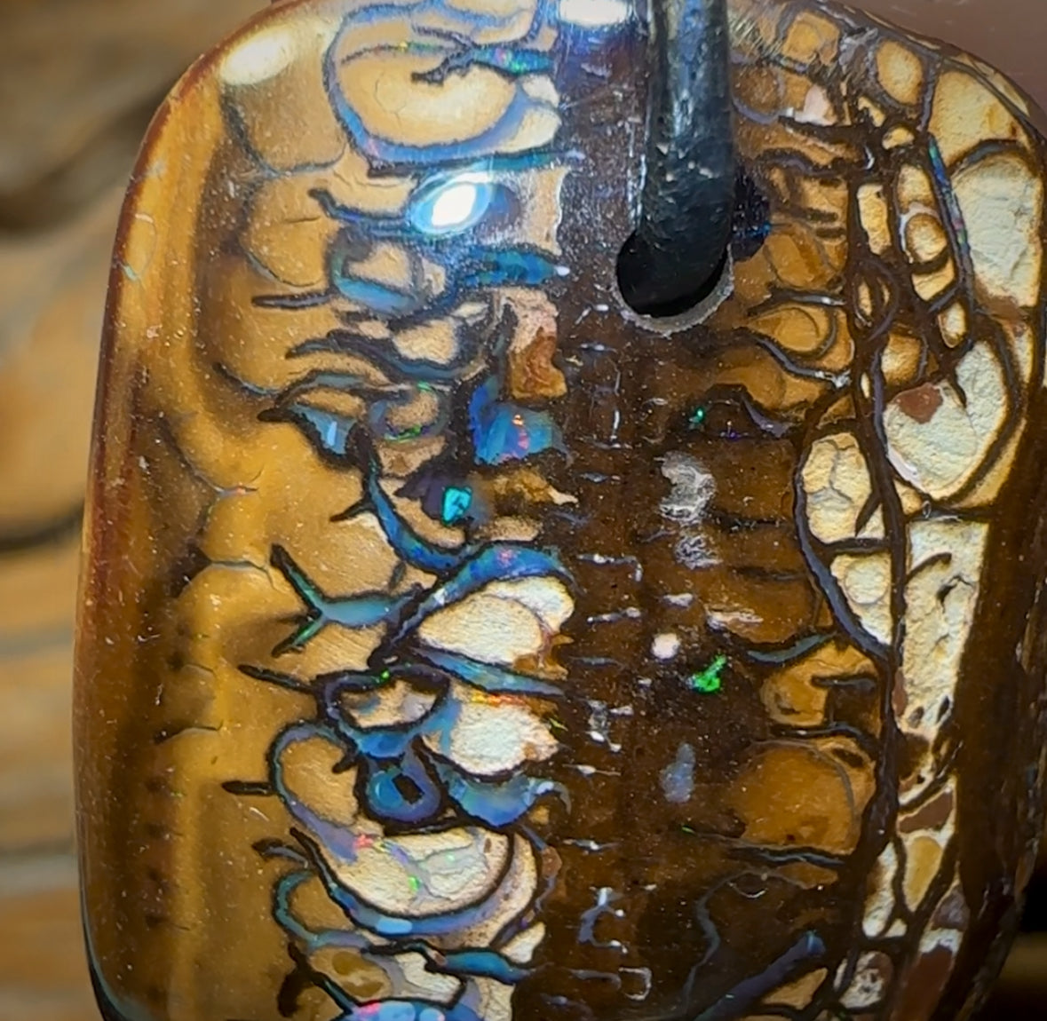 A beautiful solid, Drilled Queensland Boulder Opal necklace displaying hints of blue, green, orange and yellow colouration in tribal patterns.