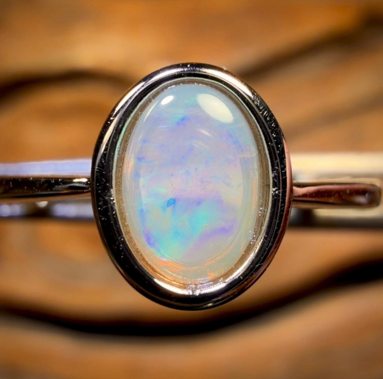 Une magnifique bague en argent sterling (925) et opale, ornée d'une opale cristal d'Australie-Méridionale taillée en forme ovale.