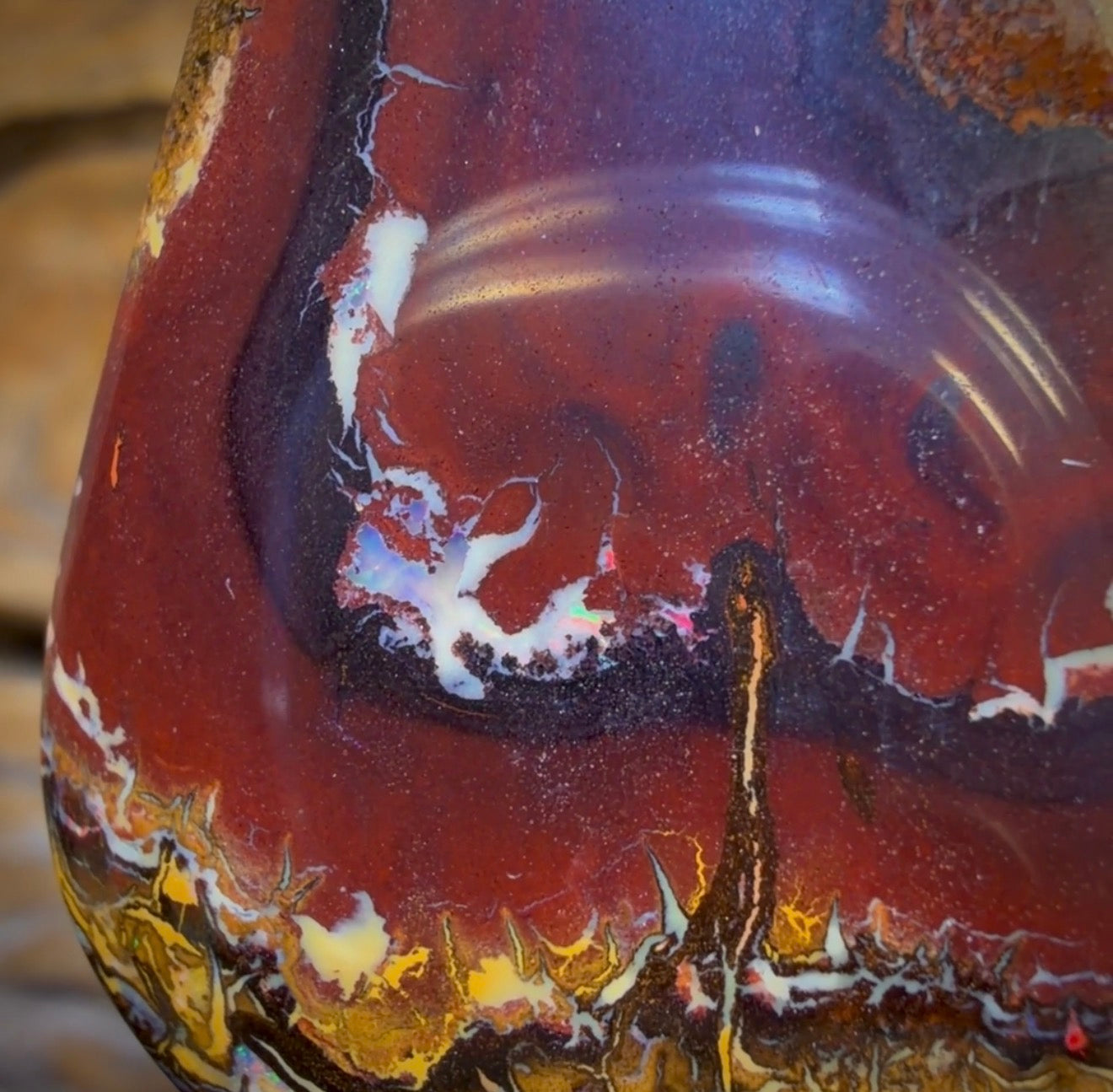 Cette pierre présente une opale potch aux motifs tribaux contrastant avec des tons terreux ocre et beige.